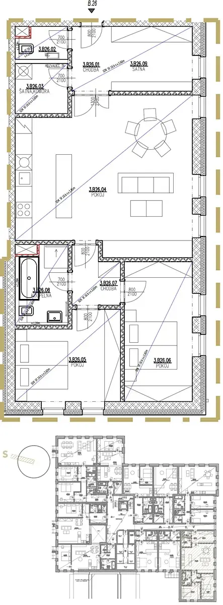 Nabízíme k prodeji nadstandardní byt (B26) o dispozici 3+kk a celkové výměře 96,5 m² dle NOZ (čistá užitná plocha 90,9 m²). Byt se nachází ve 3. podlaží a je orientován převážně na jihozápad, což zajišťuje dostatek přirozeného světla po většinu dne. K bytu náleží také sklepní kóje o velikosti 2,6 m².