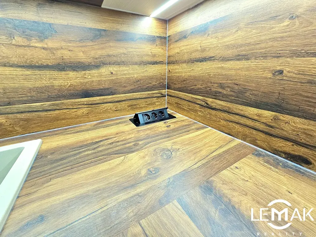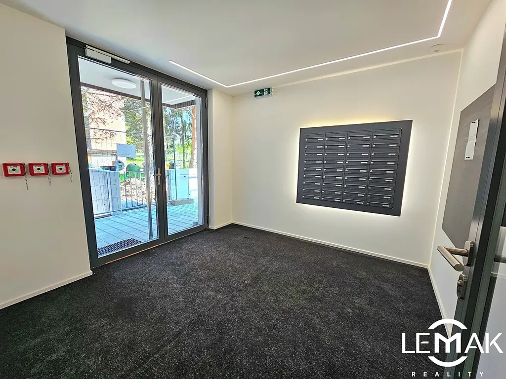 Prostorný obývací pokoj se vstupem na hlavní terasu, ložnice s šatní skříní a vstupem na menší terasu. Na terasách je doděláno stínění. Podlahy v obytných místnostech kryje lepený vinyl, na chodbě a v koupelně velkoformátová dlažba.