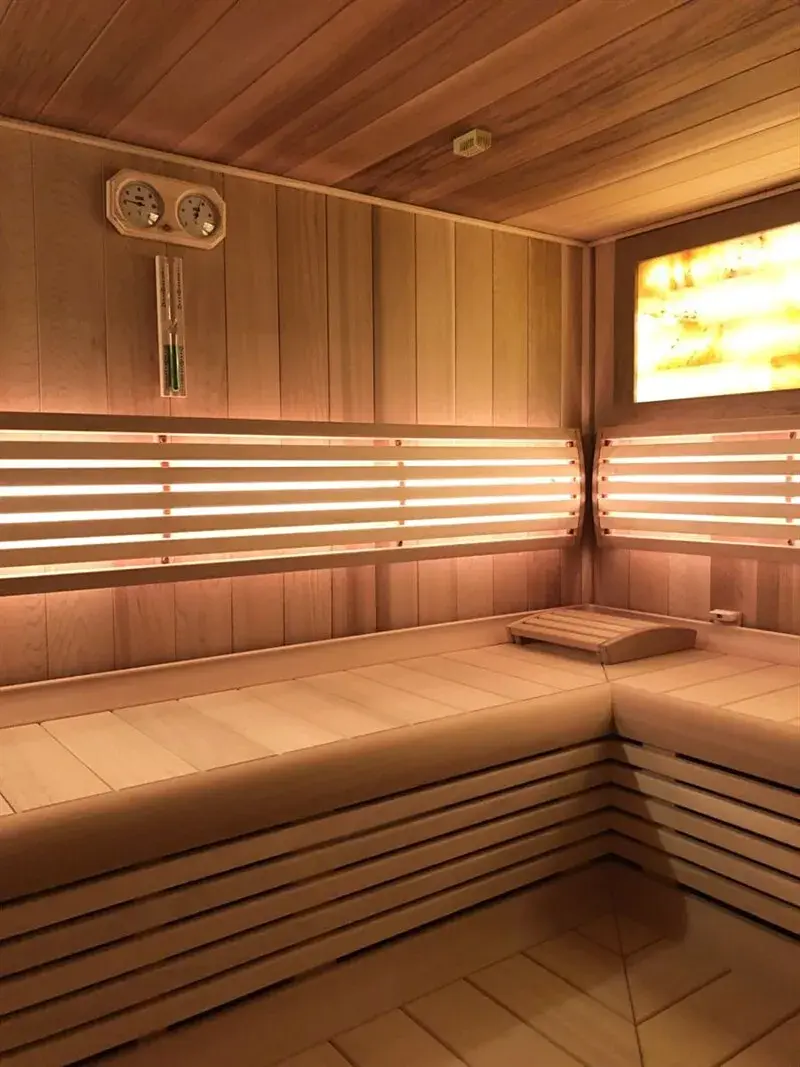 Spodní podlaží bytu nabízí zcela unikátní přidanou hodnotu v podobě soukromé wellness zóny. Nachází se zde profesionální sauna pro 6 osob se solným panelem, sprcha, samostatné WC, prádelna, úklidová místnost a sklad. Tento prostor lze zároveň flexibilně využít jako ateliér, domácí pracovnu či studio.