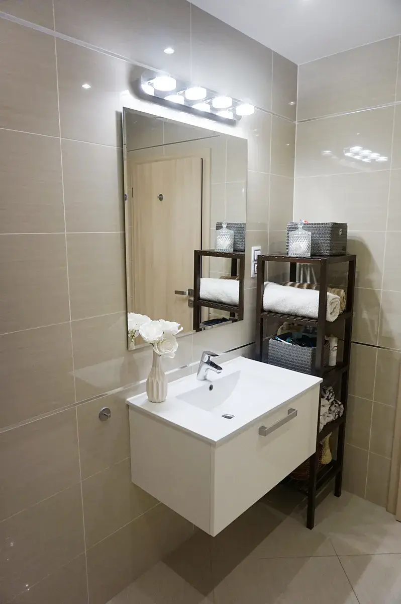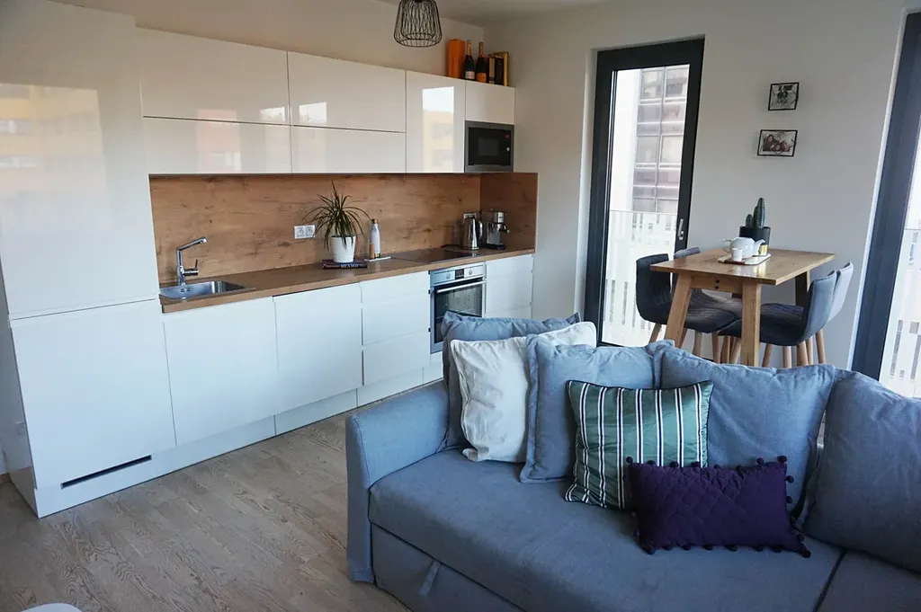 Dispozice bytu zahrnuje prostornou vstupní chodbu s vestavěnou skříní, obývací pokoj s moderním kuchyňským koutem, samostatnou ložnici a koupelnu s vanou a toaletou. Podlahy tvoří kombinace velkoformátové keramické dlažby a třívrstvé dřevěné plovoucí podlahy. Vytápění je centrální. Velkoformátová hliníková okna zajišťují dostatek denního světla.