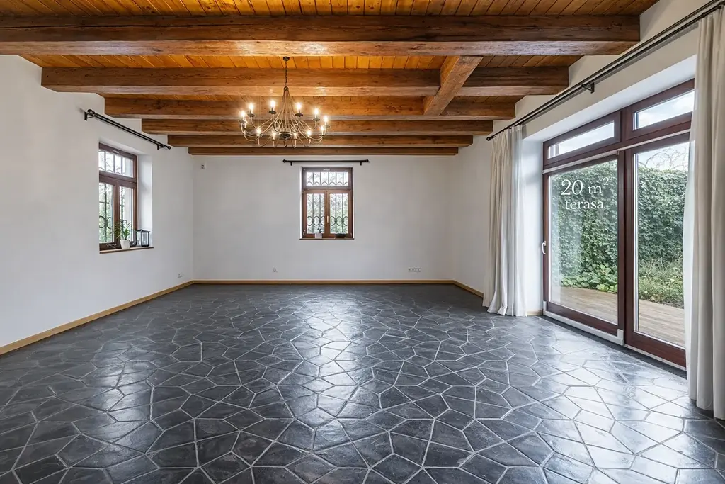 Byt o celkové ploše 170 m² je situován v přízemí komorního domu a nabízí velmi příjemné bydlení s přímým vstupem na terasu o velikosti 20 m² a do soukromé zahrady. Nemovitost je nezařízená a řešená jako praktický mezonet ve dvou podlažích.
