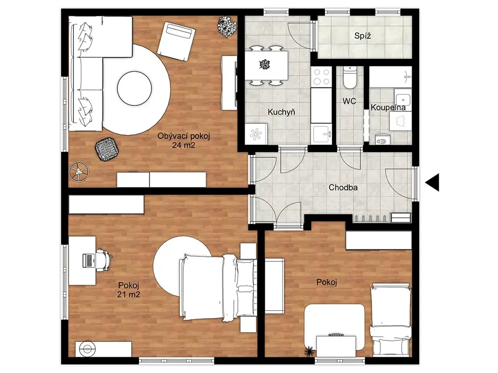 Dispozičně je byt tvořen vstupní chodbou, ze které se vchází do 3 samostatných pokojů a dále do kuchyně, koupelny a na toaletu. Kuchyň je vybavena samostatnou linkou, s nerezovým dřezem a baterií, digestoří, elektrickým sporákem a myčkou. Pro ukládání potravin můžete využít prostornou spižírnu s možností samostatného vstupu a odvětráváním okny.