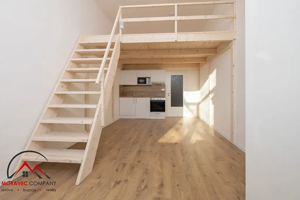 Výhodou bytu je vyvýšené patro, které nabízí další prostor a zvětšuje tak celkovou užitnou plochu. Součástí nájmu je také vyhrazené parkovací stání a sklep.