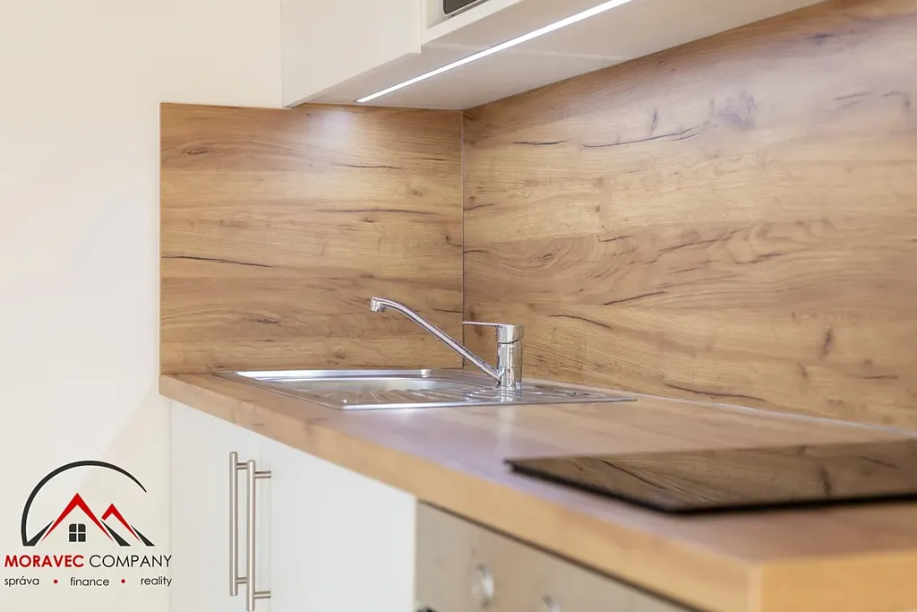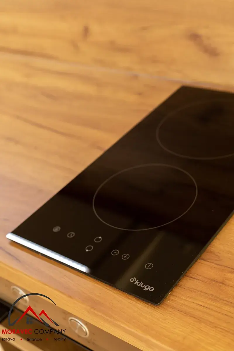 Vybavení bytu zahrnuje kuchyň s elektrickou troubou, indukční varnou deskou, digestoří, zabudovanou lednicí a mikrovlnnou troubou. Koupelna je vybavena sprchovým koutem, pračkou, praktickými skříňkami, zrcadlem a WC. Ohřev vody zajišťuje elektrický bojler.