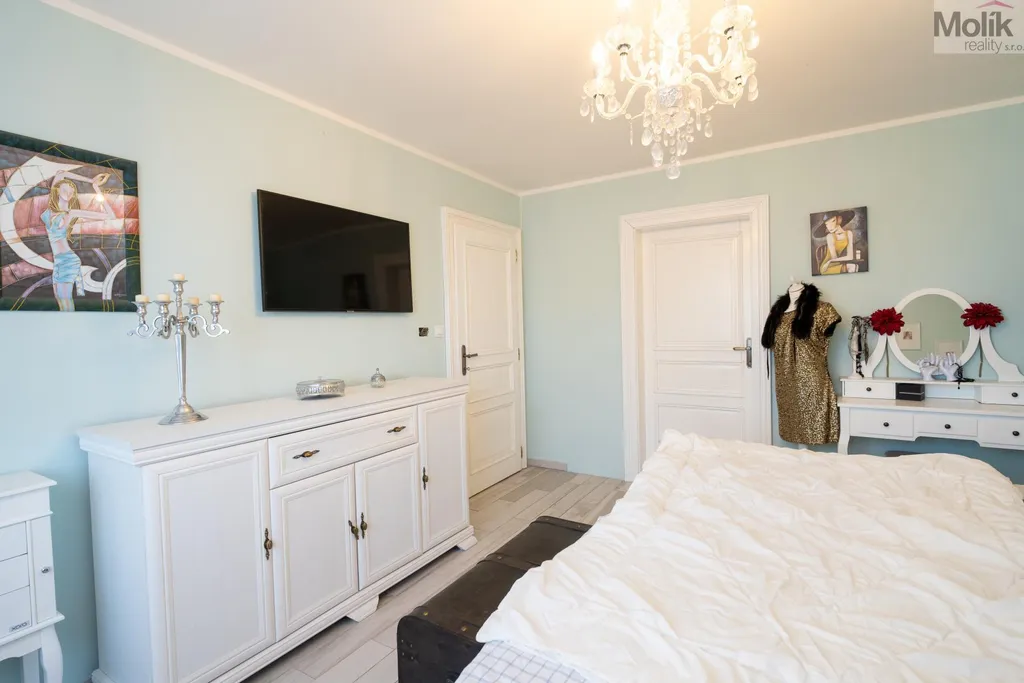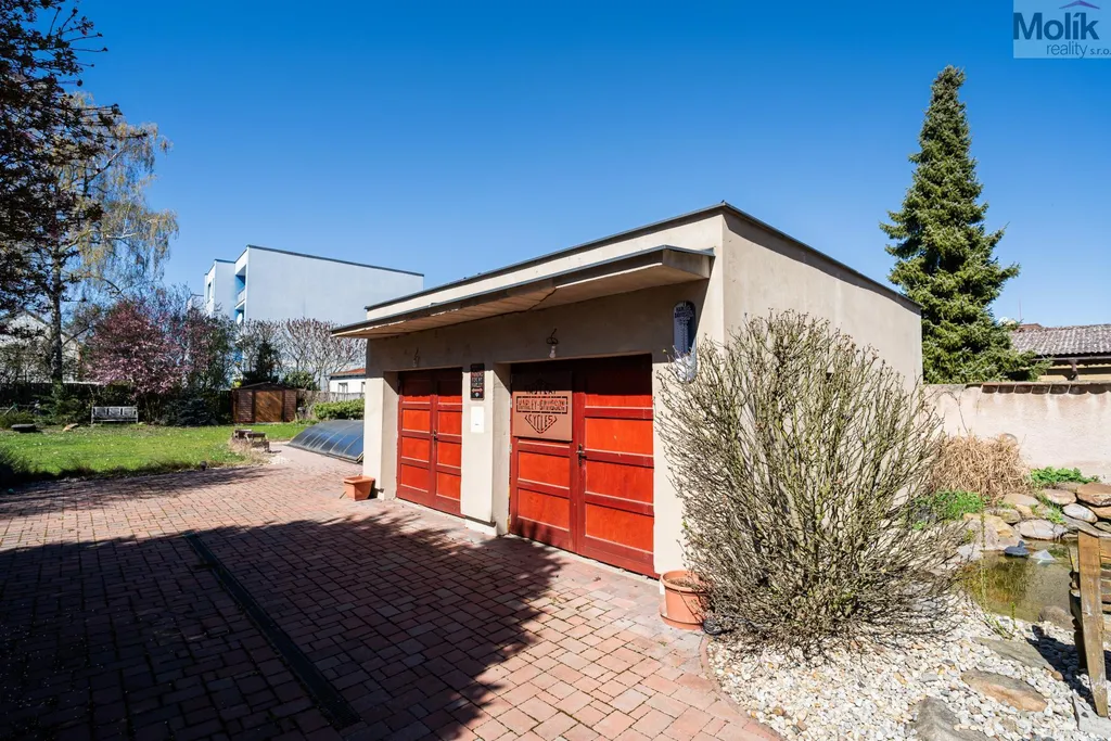 Výjimečné zázemí naleznete také v exteriéru. Na pozemku stojí prostorná vytápěná dvougaráž, která je podsklepená a ukrývá technické zázemí, včetně bazénové filtrace.