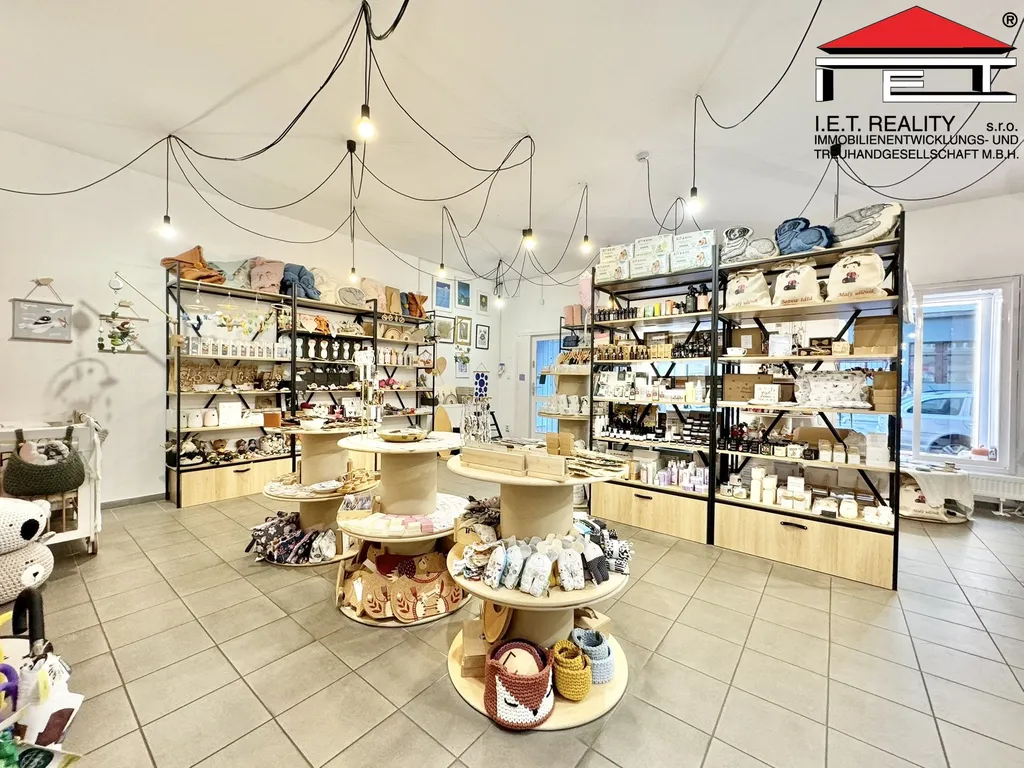 Přední část disponuje velkou výlohou, přímým vstupem z ulice a prostornou reklamní plochou. Prodejní plocha je v praktickém tvaru písmene "L", dále je prostor vybaven vlastním zázemím s WC a druhým vstupem z vnitrobloku.