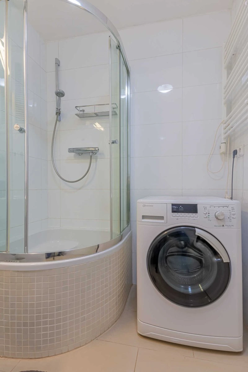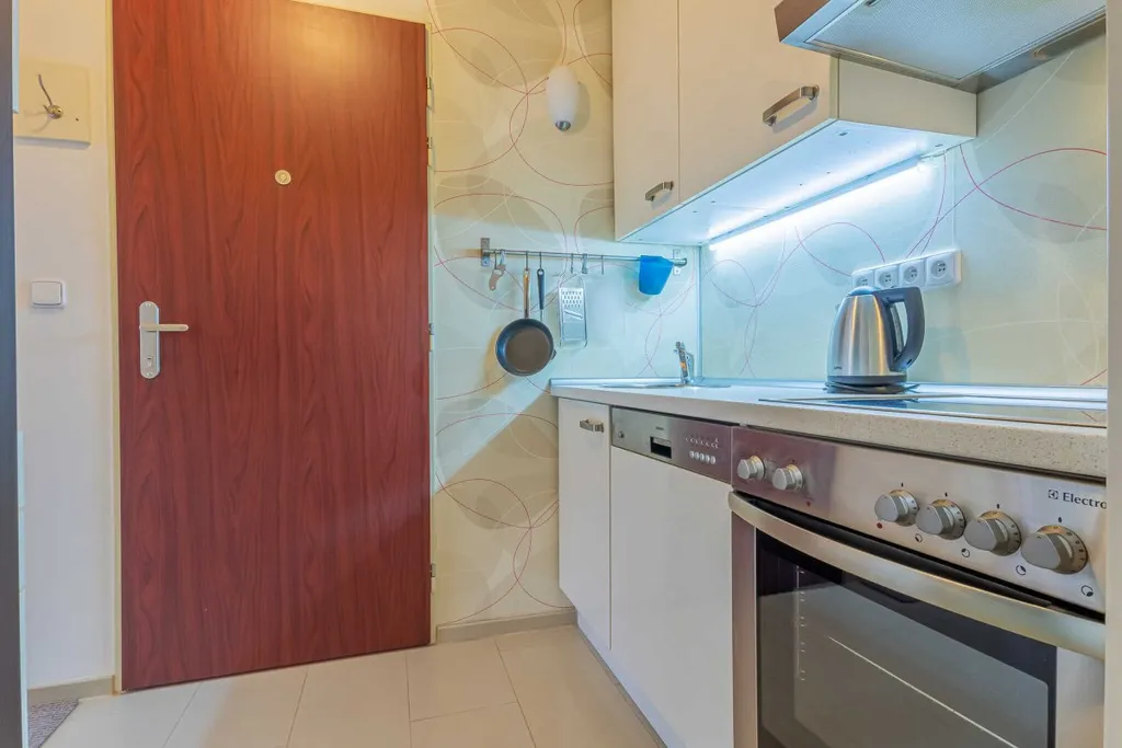 Byt se nabízí částečně vybavený. Kuchyňská linka disponuje vestavěnou elektrickou troubou, sklokeramickou deskou a myčkou. Obývací část je útulně zařízená postelí, prostornou šatní skříní a stolem s židlí. V nové koupelně je sprchový kout, umyvadlem, pračkou a toaletou.