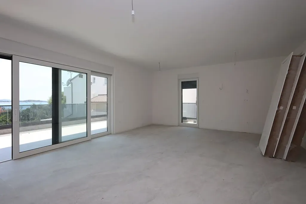 Dovolujeme si Vám nabídnout na prodej nový apartmán se 3 ložnicemi a prostornou terasou blízko moře ve městě Vodice v Šibenické oblasti v Chorvatsku. Nachází se v moderní apartmánové budově ve výstavbě, jejíž dokončení a možné nastěhování je plánováno na květen roku 2024. Budova má suterén, přízemí, dvě patra a střešní terasy a je v ní 10 apartmánů.