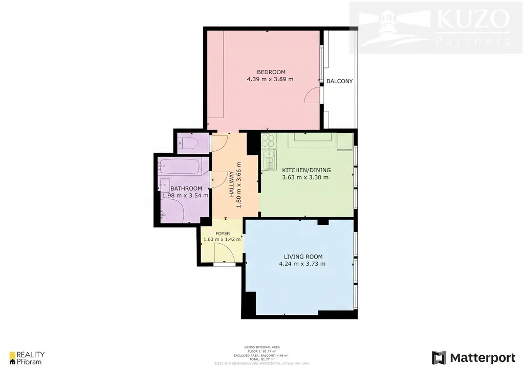 Vnitřní plocha: 59,28 m² (dle Katastru nemovitostí) / 61,77 m² (vnitřní plocha měřená technologií Matterport).