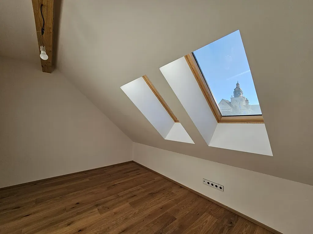 Podkrovní byty mají bezesporu své osobité kouzlo a každý je originální. Typické jsou zde zkosené stropy, přiznané trámy a sloupy.. Podlahová plocha bytu je přibližně 80 m2. Je však potřeba počítat se zkosenými stěnami (plocha bez schodiště a po odečtu zkosení: cca 75 m2 + terasa 10 m2). Dispozice bytu umožňuje užívání jak ve variantě 4+kk, tak i jako velkorysé 3+1. Orientace bytu je na severovýchodní a jihozápadní stranu. Z terasy je krásný výhled na centrum města, z ložnice pak na Ještěd. Středem bytu je obývací pokoj s kk, z kterého se vstupuje do tří neprůchozích pokojů a na terasu. Koupelna obsahuje vanu i sprchový kout a nadstandardně široké umyvadlo se skříňkou (šířka 120 cm). WC je samostatné. Podlahy v obytných částech bytu jsou dřevěné, v koupelně a WC je velkoformátová ker. dlažba. Dveře jsou dřevěné s obložkovými zárubněmi, vyrobené na zakázku. Kuch. linka má tvar L, vybavena je vest. spotřebiči (myčka 60 cm, chladnička s mrazákem, horkovzdušná a mikrovlnná trouba, indukční deska, digestoř). Dostatečný pracovní prostor zajistí kuch. ostrůvek. V předsíni je vestavěná šatní skříň. Okna jsou plastová s izolačním trojsklem a dřevěná s dvojsklem. Vytápění a ohřev vody probíhá přes vlastní plynový kotel umístěný v menším prostoru za koupelnou. V celém bytě je teplovodní podlahové topení. Společně s vestavbou bytu proběhla také výměna střešní krytiny domu. Parkování je možné v ulici před domem. K bytu náleží podíl na společné zahrádce a sklepních prostorech, které prozatím