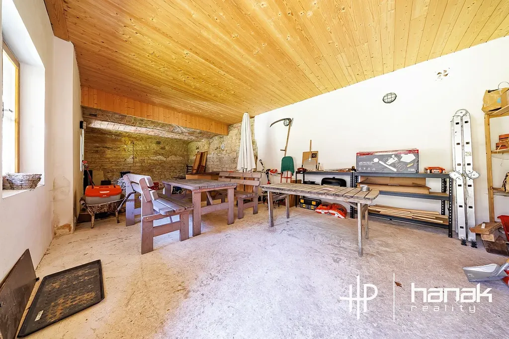 Vedlejší část objektu pak tvoří velký, skladovací prostor, kde je možnost zbudování sauny, letní kuchyně vč. posezení. V patře prostor vybízí k vybudování zážitkové ložnice pro děti.