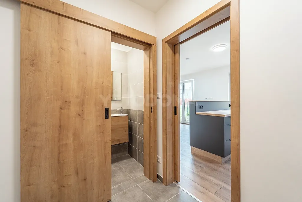 V dolním podlaží je toaleta, technická místnost a prostorný obývací pokoj s kuchyní a vstupem na vlastní zahradu o rozloze 155 m2. V horním patře jsou dva pokoje s balkonem, šatnou a koupelnou.