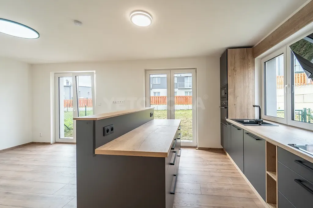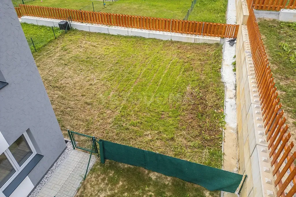 Dispozice bytu je 3+kk s výměrou přibližně 67 m² a vlastní zahradou o výměře 155 m² a balkonem.