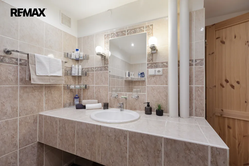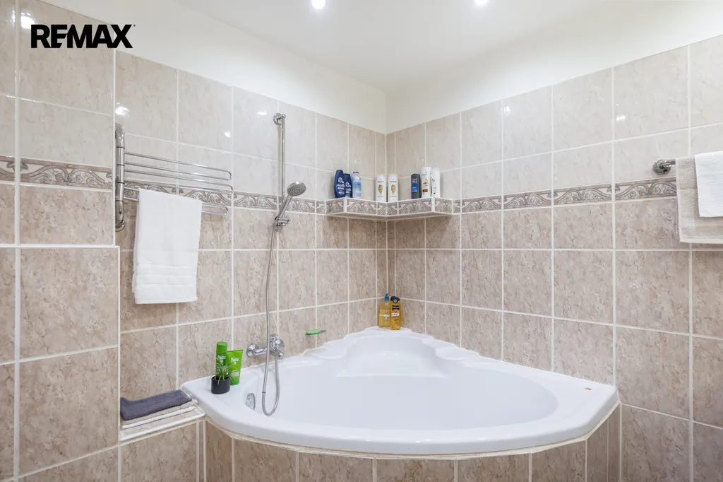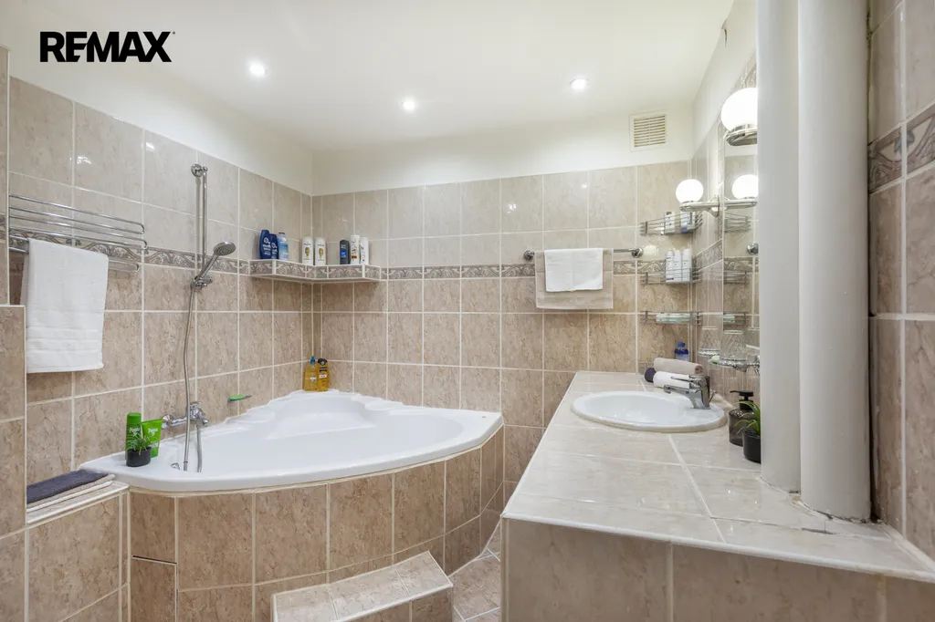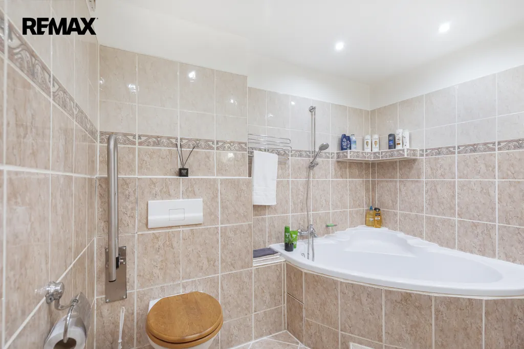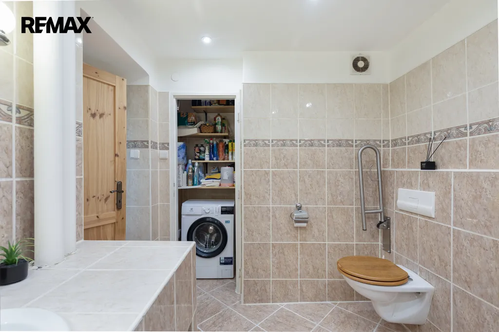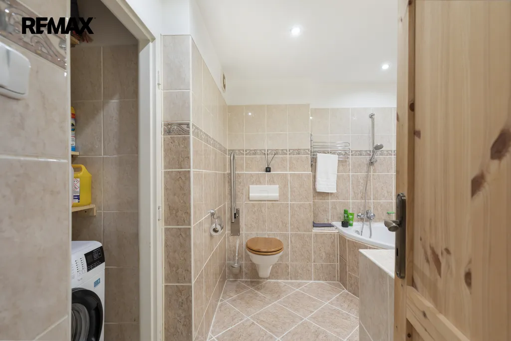 ✅ Koupelna s rohovou vanou pro příjemnou koupel i ve dvou, podélná umývadlová deska , zrcadlo s osvětlením, béžové obklady s dlažbou, výklenek pro pračku i sušičku s možností uzavření interiérovými dveřmi, závěsné WC