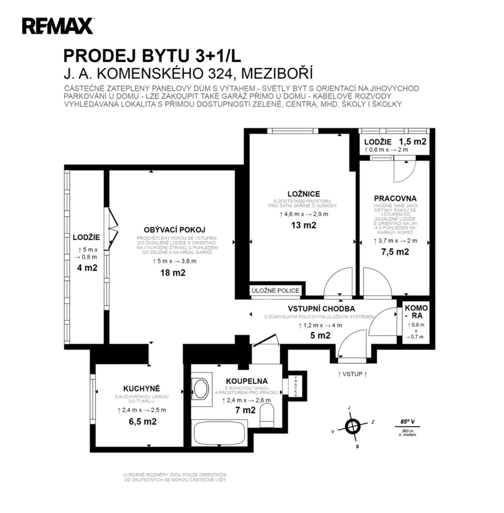Nabízíme k prodeji útulný byt po částečné rekonstrukci 3+1 s velkou a malou zasklenou lodžií, sklepem a dalším nadstandardně rozměrným sklepem s plochou 20m2 / pronajatým od SVJ za 160 Kč/měs./ v osobním vlastnictví o užitné ploše 67,2 m² / byt 61,1 m2, lodžie velká 4,5 m2, lodžie malá 1,6 m2 + sklepní koje jako další prostor ( není započten v užitné ploše ) v klidné a vyhledávané lokalitě Meziboří, J.A.Komenského 324. K bytu náleží sklep 2m2 + další pronajatý sklep 20 m2. Byt se nachází v 8. NP částečně zatepleného domu s výtahem. / vnitřní příčky cihla / Orientace jihovýchodní slunná strana.