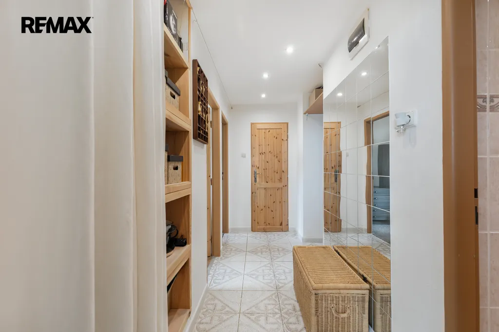 ✅ Předsíň - vestavná masivní policová stěna za závěsem s dostatkem úložného místa, zrcadlová stěna, praktická béžově laděná dlažba