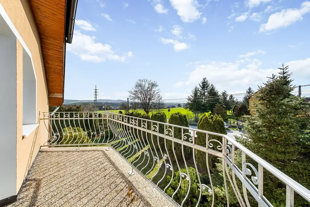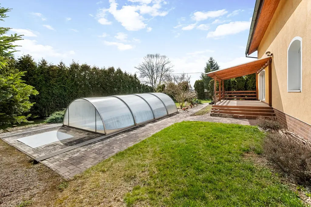 Dům obklopuje okrasná zahrada s parkovou zelení, s bazénem, s velkou parkovací plochou.