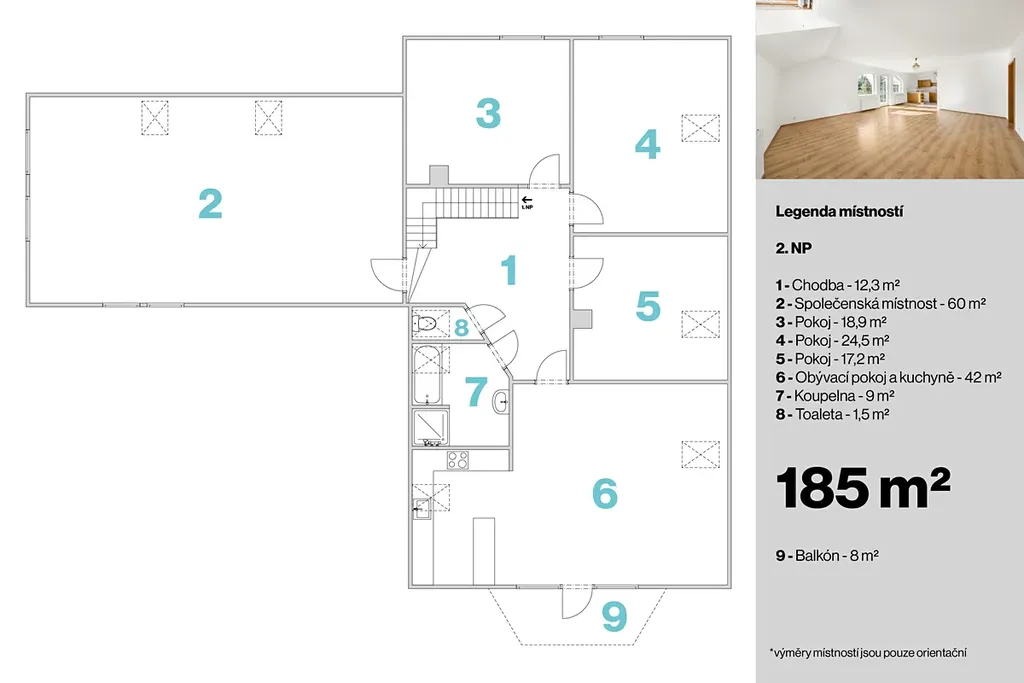 Ve 2.NP se nachází hala - 12,3m², pokoj - 18,9m², pokoj - 24,5,m², pokoj - 17,2m², obývací pokoj s kuchyní - 42m², koupelna - 9m², toaleta - 1,5m² a společenská místnost - 60m², celkem bytová plocha - 185m² + balkon - 8m².