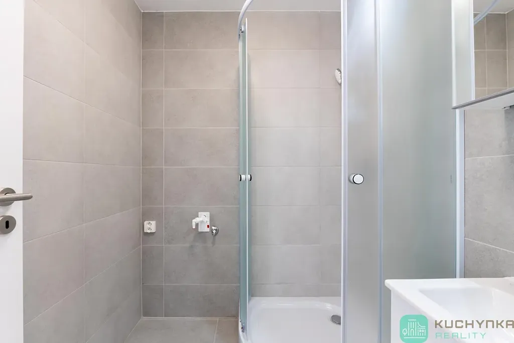 Zděné koupelnové jádro s moderním obkladem, sprchou, prostorem na pračku i sušičku a oddělenou toaletou s menším umyvadlem.
