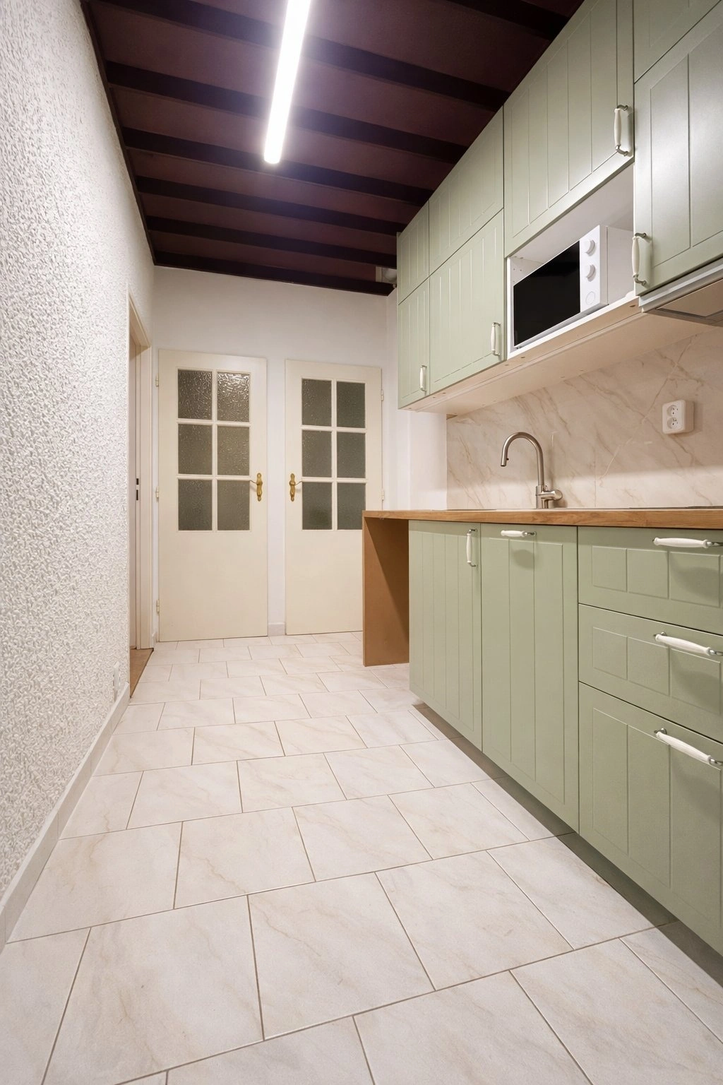 Dispozice bytu tvoří předsíň, průchozí kuchyně, koupelna, samostatné WC, komora a dva samostatné pokoje, oba s vestavěnými patry na spaní, přičemž z jednoho z nich je vstup na balkon. Díky uspořádání je byt vhodný i pro spolubydlení.