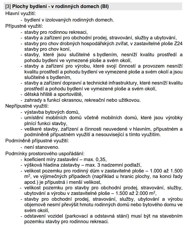 Pozemek je vhodný pro výstavbu zejm. rodinného domu, popř. je možné jej na vlastní náklady rozdělit a vybudovat zde dva rodinné domy. Dle aktuálního ÚP je předmětný pozemek vedený jako plocha (BI) Bydlení v rodinných domech. Minimální plocha k výstavbě rodinného domu je v tomto území nastavena na 1 000 – 1 500 m2. Bližší specifikace ploch je uvedená v přiloženém ÚP.
