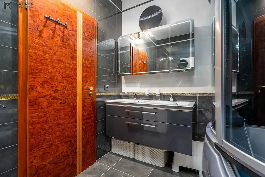 Interiér byl realizován s použitím kvalitních a nadstandardních materiálů. Současné provedení odpovídá stylu své doby, přičemž dispozice i charakter bytu zároveň umožňují poměrně snadnou úpravu do výjimečného moderního bydlení podle vkusu nového majitele.
