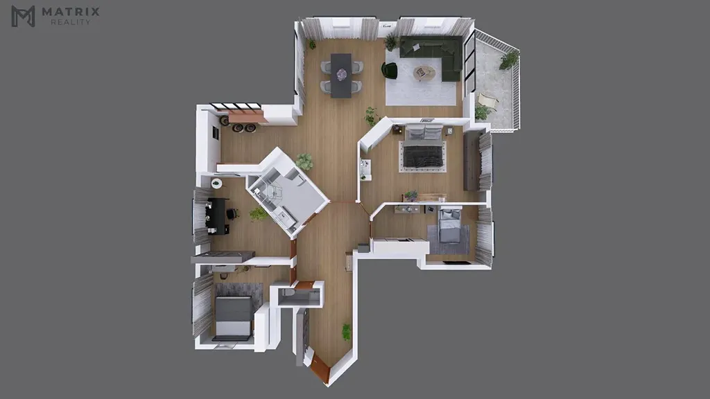 Jednou z hlavních předností bytu je jeho praktické dispoziční řešení. Celý byt se nachází na jednom podlaží, nejde tedy o mezonet, což přináší výrazně pohodlnější každodenní fungování pro rodinu, děti i starší členy domácnosti. Dispozice nabízí velkorysý obývací pokoj s jídelnou, samostatnou kuchyň, 3 ložnice, pracovnu, 2 koupelny s WC a dostatek úložných prostor.