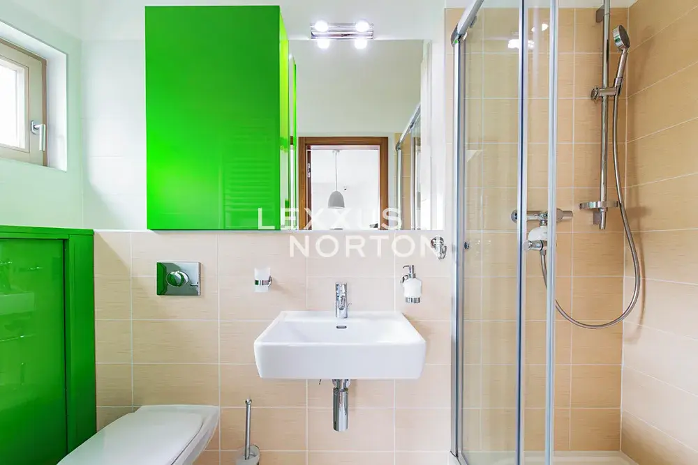Kuchyňský kout je vybaven sklokeramickou varnou deskou, troubou, lednicí, mrazákem, mikrovlnnou troubou a myčkou nádobí. Součástí en-suite koupelny je sprchový kout a toaleta. Hlavní koupelna disponuje vanou, dvěma umyvadly, toaletou, bidetem a pračkou.