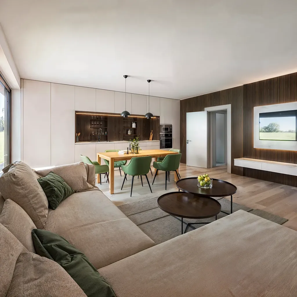 Při výstavbě rodinného domu dbáme na následný velmi úsporný provoz při vysokém standardu použitých technologií. Samozřejmostí je tedy podlahové topení, tepelné čerpadlo, rekuperace, hliníková okna (trojsklo), vylepšená tepelná izolace (zateplení domu), regulační technika a příprava na fotovoltaiku.