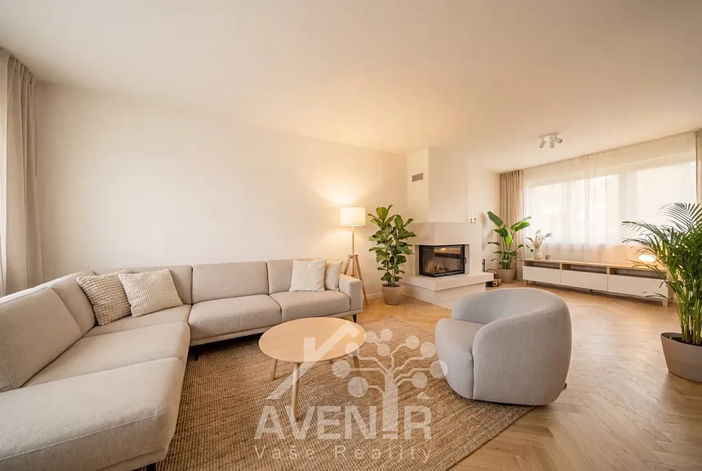 Dominantou domu je prostorný obývací pokoj s krbem, který vytváří příjemnou atmosféru zejména v chladnějších měsících.