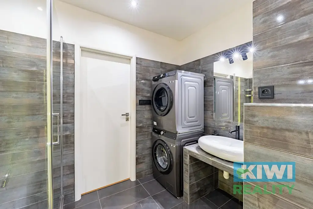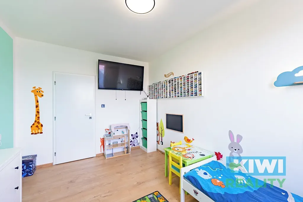 Dispozice bytu je velmi praktická. Po vstupu se ocitnete v prostorné chodbě, ze které vede vstup do samostatného dětského pokoje orientovaného na sever, dále do velké koupelny s WC, kde najdete jak vanu, tak sprchový kout a dostatek místa pro pračku i sušičku. Dominantou bytu je prostorný obývací pokoj, který je průchozí a nabízí dostatek místa nejen pro odpočinek, ale i pracovní kout nebo jídelní zónu. Přes kuchyň se dostanete do ložnice se zasklenou lodžií (cca 4 m²), ideální pro ranní kávu nebo relax. Obývací pokoj, kuchyně i ložnice jsou orientovány na západ, takže byt působí světlým a příjemným dojmem.