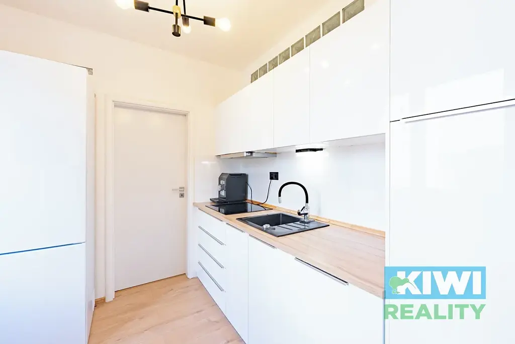 Byt se prodává částečně vybavený – zůstává kompletní vybavení chodby, šatní skříň v ložnici a kuchyňská linka včetně spotřebičů (vestavěná trouba, mikrovlnná trouba, myčka, varná deska a lednice).