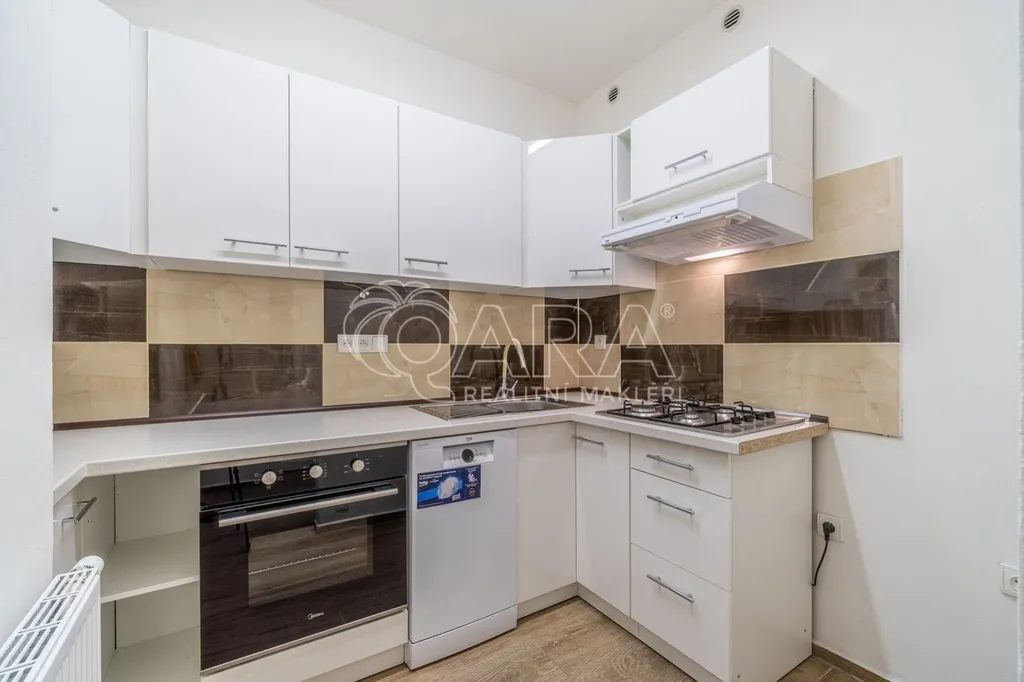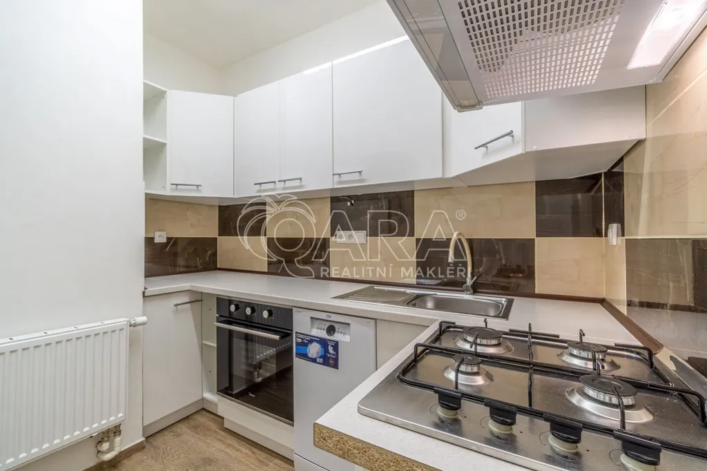 V bytě je k dispozici kuchyňská linka s plynovým sporákem, digestoří, pečící troubou a myčkou nádobí.