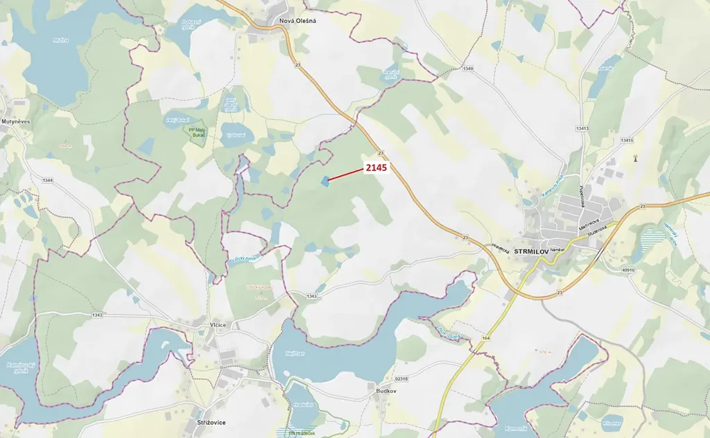 Lesní pozemek o výměře 5413 m2, parcelní číslo 2145, podíl 1/1, katastrální území Strmilov, obec Strmilov, obec s rozšířenou působností Jindřichův Hradec, okres Jindřichův Hradec, Jihočeský kraj.