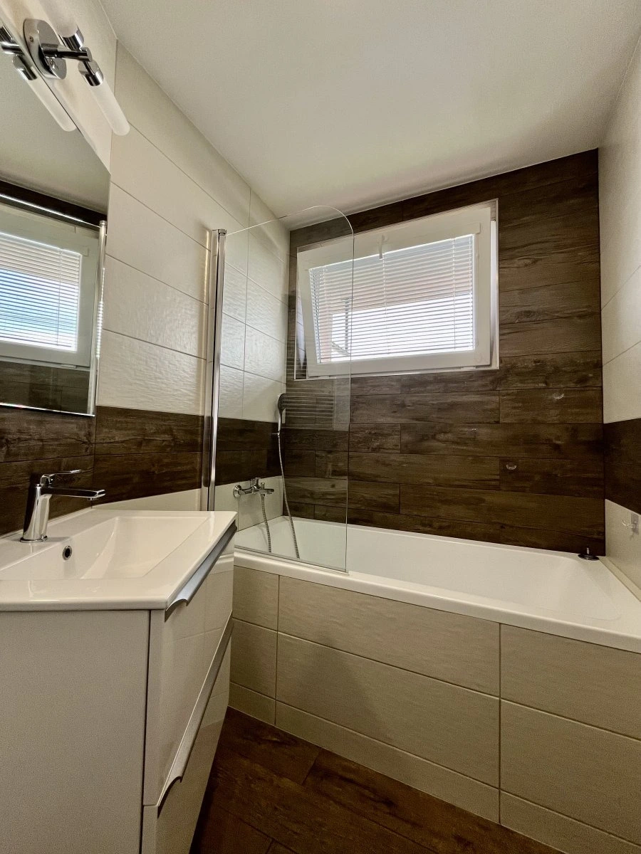 Koupelna: vana se sprchovací zástěnou, umyvadlo, skříňka