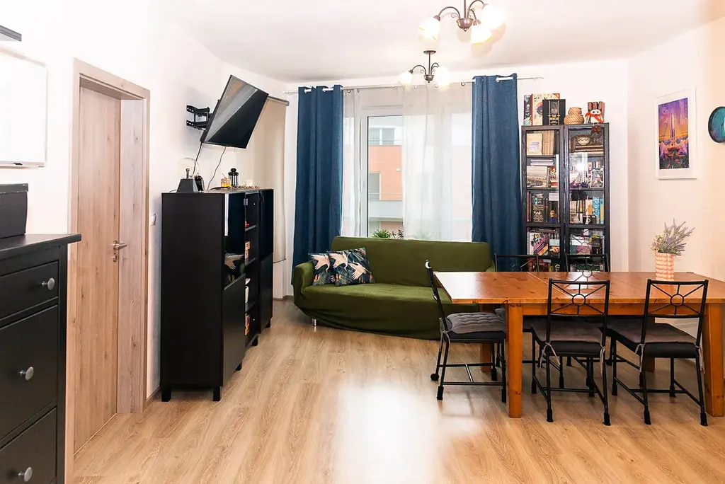- prostorný obývací pokoj s kuchyňským koutem vybaveným vestavěnými spotřebiči (trouba, varná deska, digestoř, myčka, lednice) a vstupem na zasklenou a zateplenou lodžii o velikosti 12 m²,