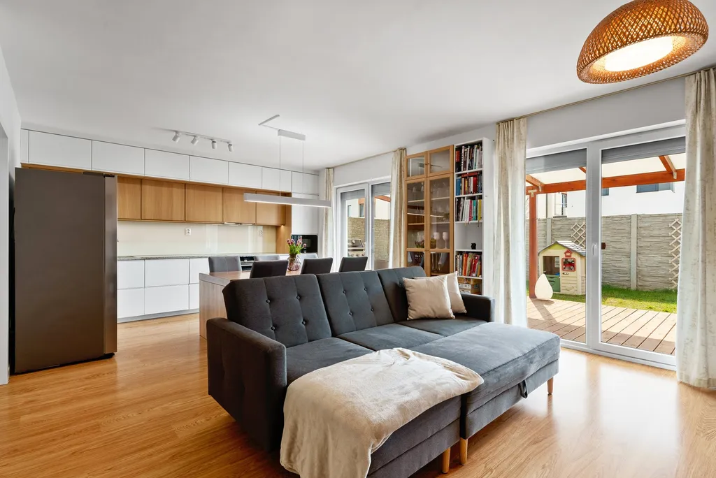 Dům nabízí nadstandardní prvky jako posuvné dveře do pouzdra, kvalitní podlahy a moderní kuchyňskou linku včetně spotřebičů. Výhodou je fotovoltaická elektrárna snižující provozní náklady.