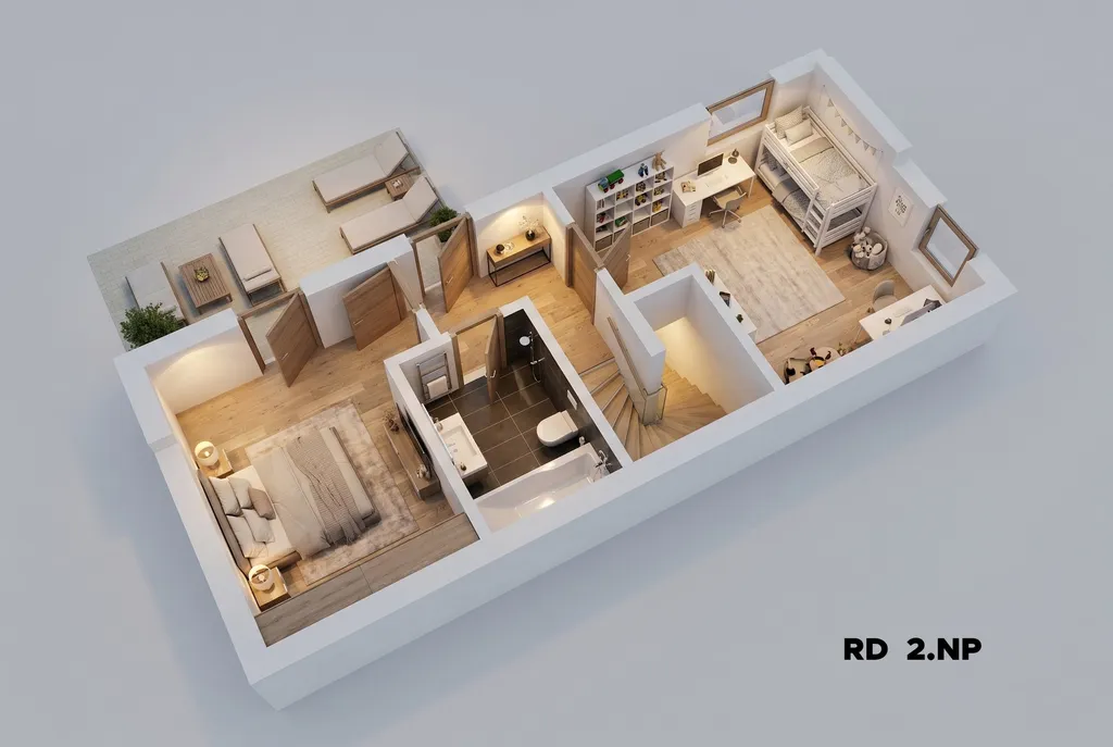 Dispozice 3+kk: v přízemí se nachází prostorný obývací pokoj s kuchyňským koutem (33 m²) a vstupem na terasu, dále zádveří, samostatné WC a technická místnost. V patře jsou dvě ložnice, koupelna a terasa o velikosti 16 m².