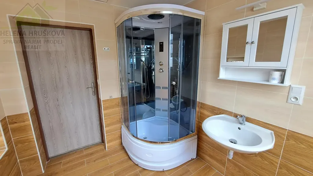 Byt tvoří, samostatný vstup, zádveří, chodba, dřevěné schodiště, kuchyň, vybavena kuchyňskou linkou s elektrickým sporákem, 2 pokoje - průchozí, prostorná koupelna se sprchovým koutem a WC, další samostatné WC.