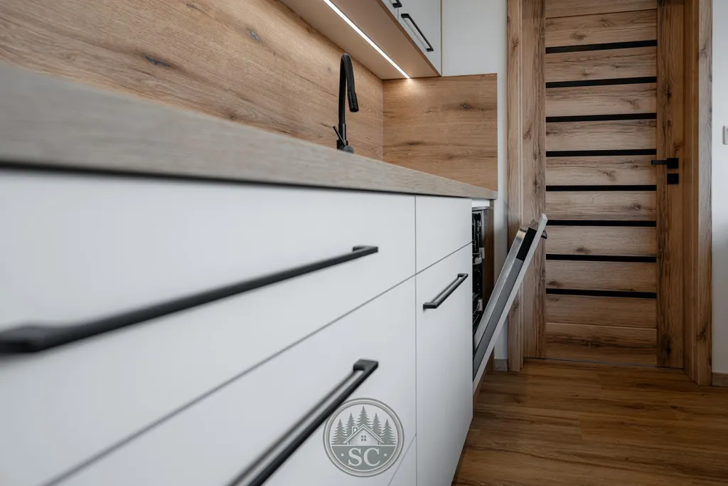 Hned při vstupu vás zaujme podsvícená vestavná skříň s integrovanou pračkou a sušičkou. Vestavné skříně i kuchyňská linka jsou vyrobeny na míru od truhláře, což je znát na použitých materiálech i kvalitě zpracování.