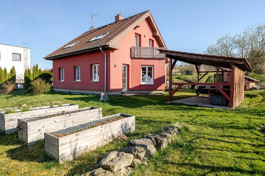 Celý dům je obklopen zatravněnou zahradou, na které je terasa s krytou pergolou a příjemným posezením. Je zde zděný kotec pro psa, který lze využít jako dřevník, dále plechový domek na nářadí. Okolo plotu domu jsou vysázené keře, které zajišťují dostatek soukromí. Před domem je velkorysý prostor předzahrádky a vjezd do garáže. Prostor je možno využít na parkování dalších vozidel.