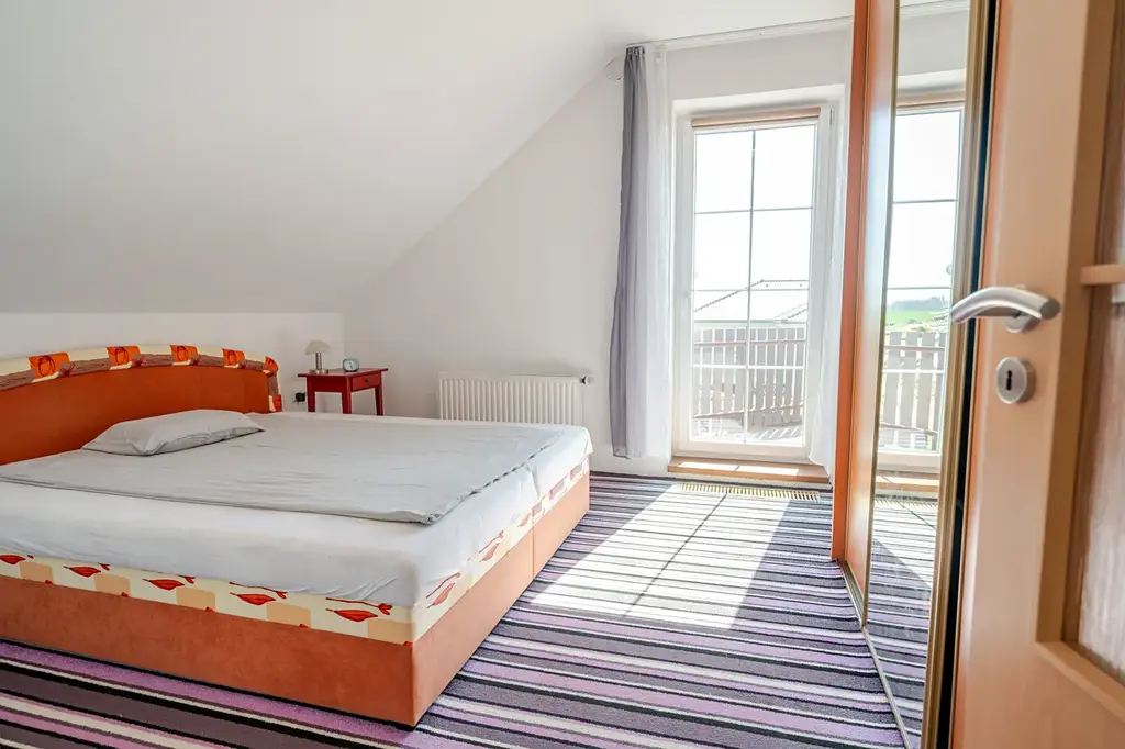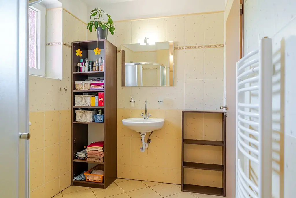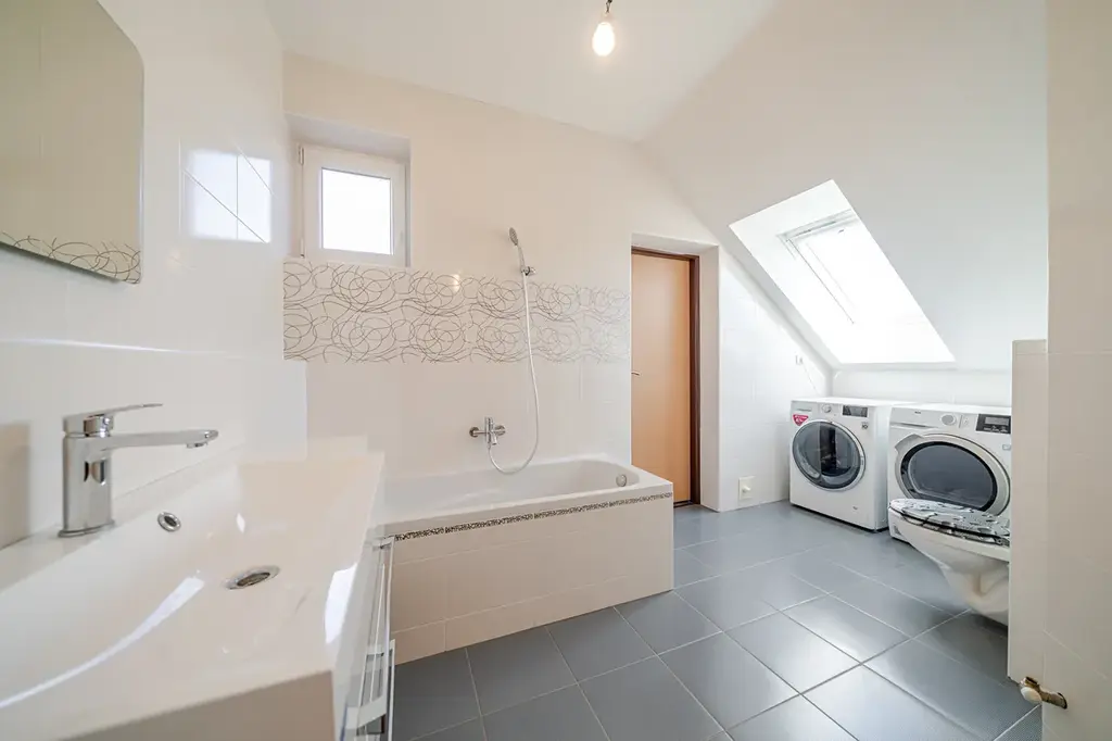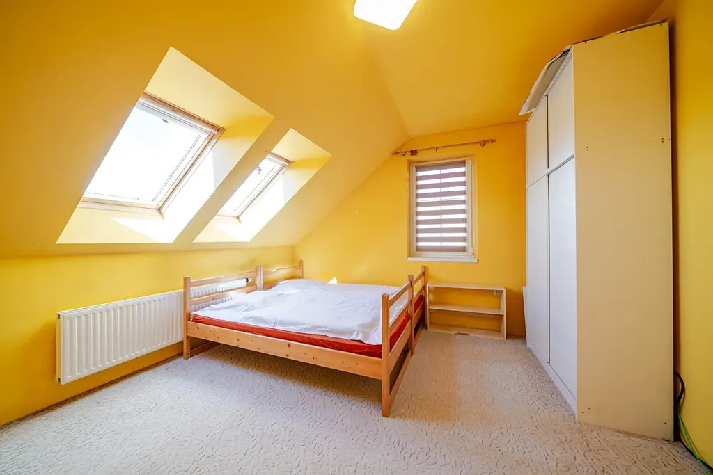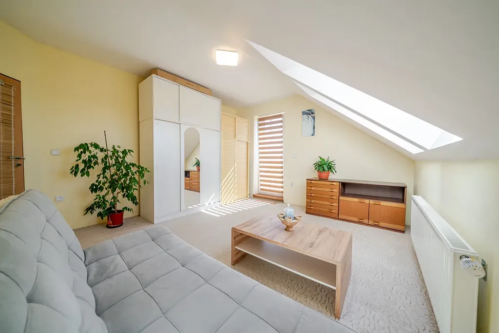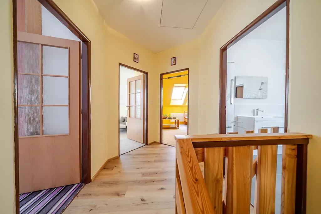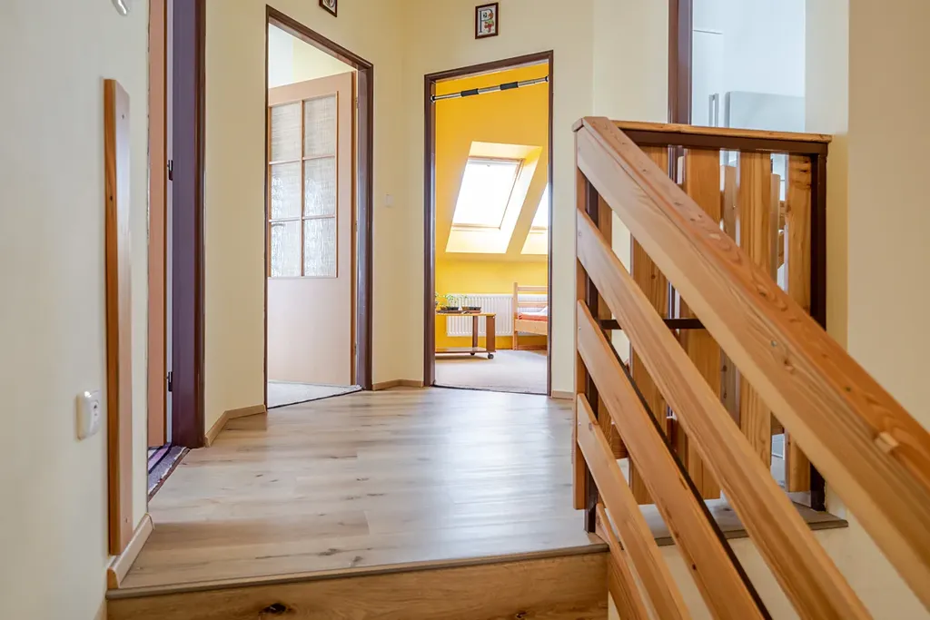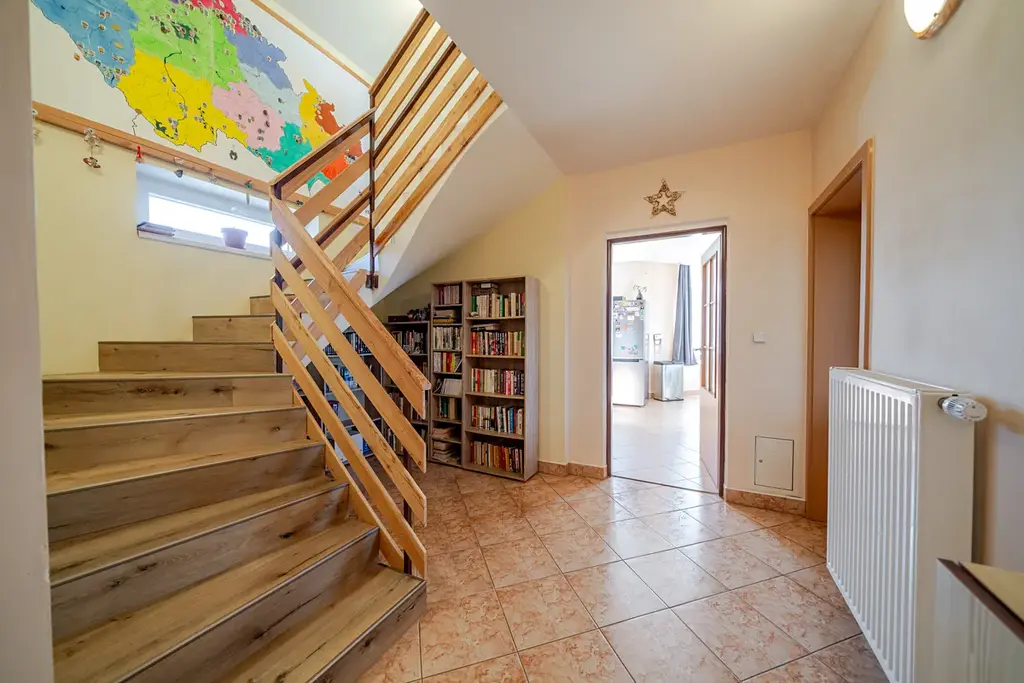 Dominantou přízemí je krásné schodiště vedoucí do patra, kde jsou tři obytné pokoje, dva z nich mají přímý vstup na slunnou terasu, dva pokoje na západ mají střešní okna, stíněná vnitřními i venkovními roletami, vytápění je zajištěno radiátory. Dále je na patře velká koupelna s vanou, umyvadlem a toaletou, je zde přípojka na pračku, topení podlahové, přípojka na topný žebřík, střešní okno. Z koupelny je vchod na prostornou, zateplenou půdu, která se dá využít jako šatna, sklad či letní byt, v přední části je radiátor a střešní okno.