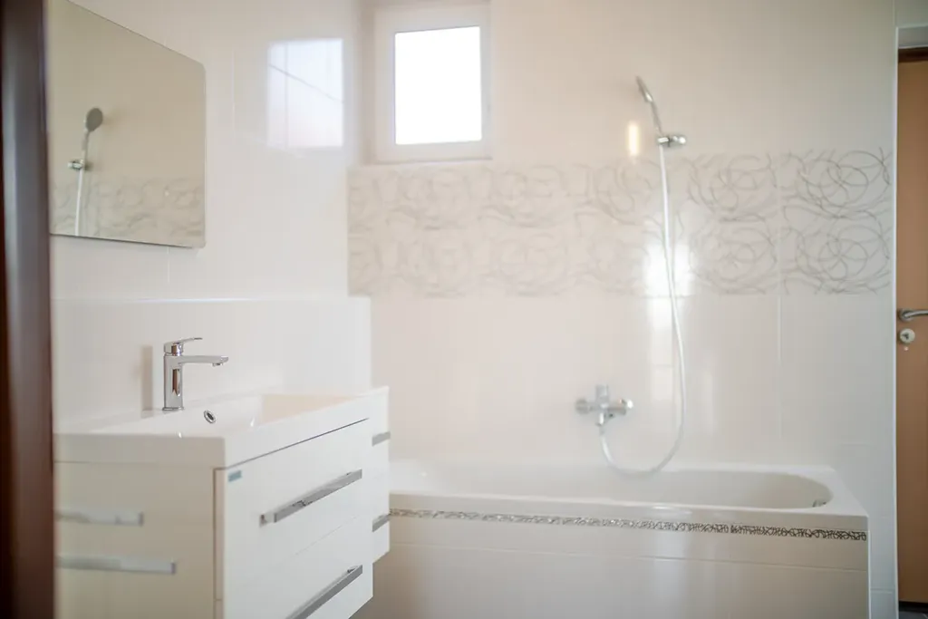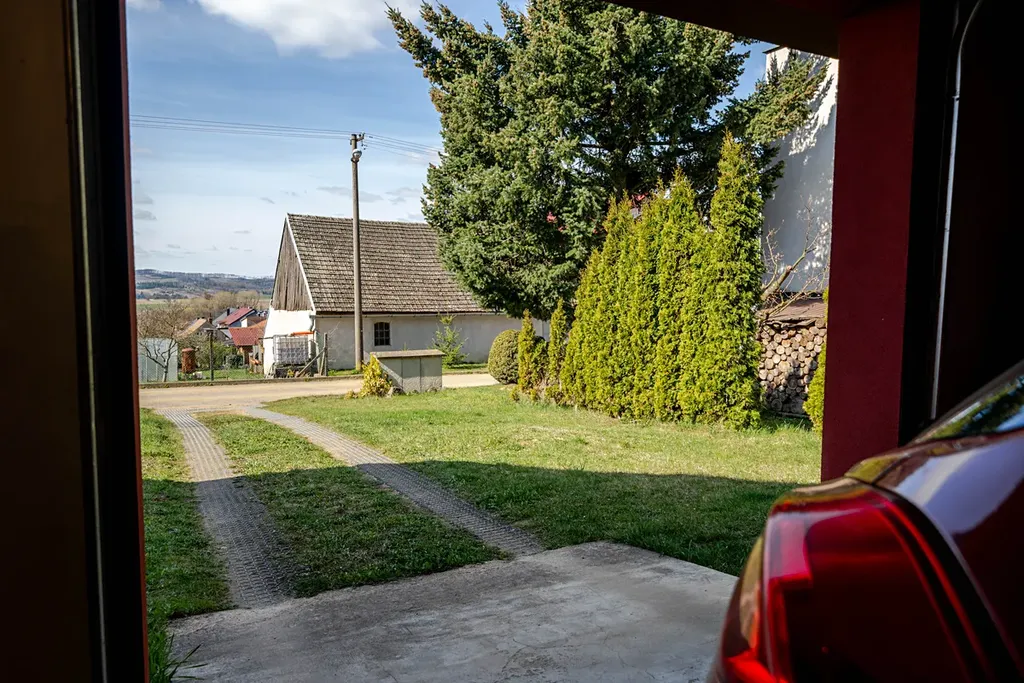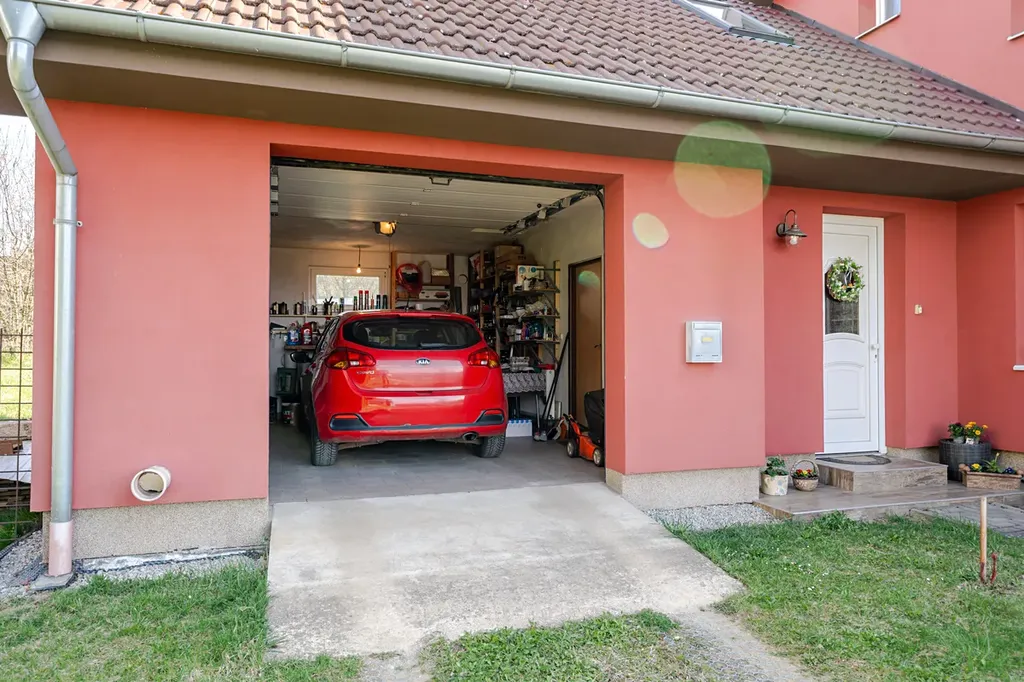 Při vstupu do domu se otevírá prostor zádveří se vstupem do prostorné garáže, do chodby, ve které je technické zázemí a je průchozí do prostor za domem, a třetími dveřmi do bytu.