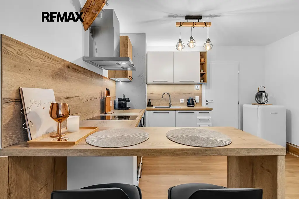 Interiér je řešen velmi prakticky a zároveň stylově – k dispozici je vstupní předsíň s vestavěnou skříní a dřevěnou šatní stěnou, moderní koupelna se sprchovým koutem a toaletou a hlavní obytný prostor propojující obývací část, ložnici a kuchyňský kout. Samozřejmostí je kompletní vybavení, díky kterému je apartmán připraven k okamžitému užívání i pronájmu.
