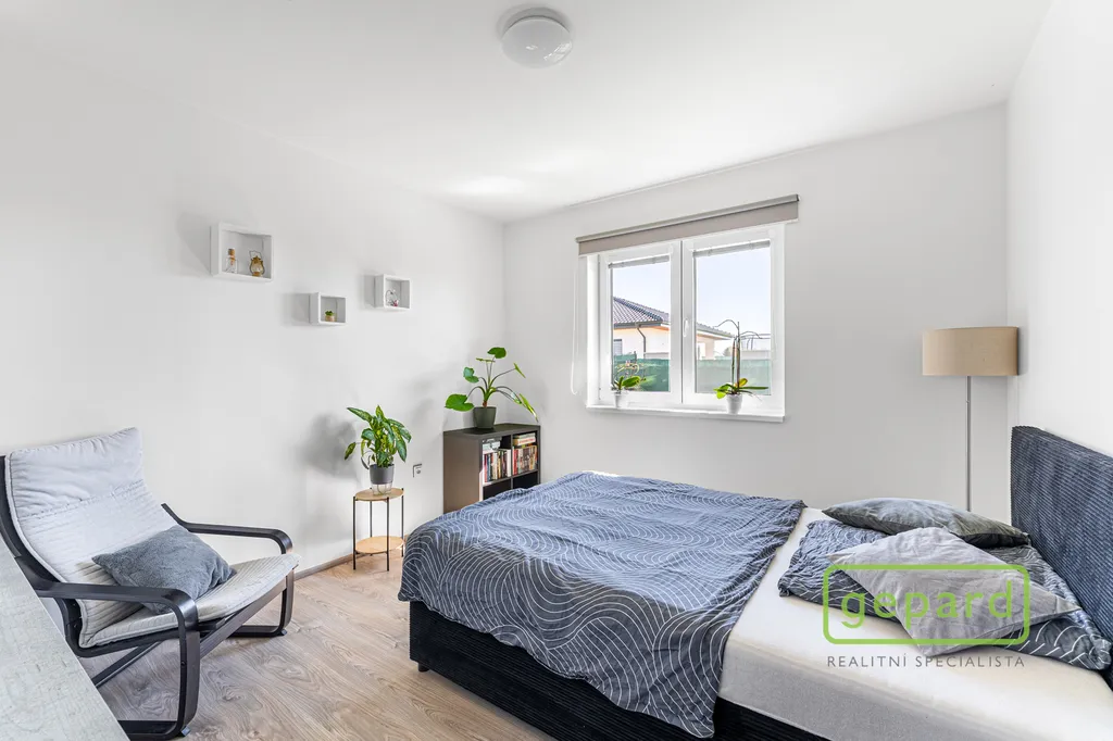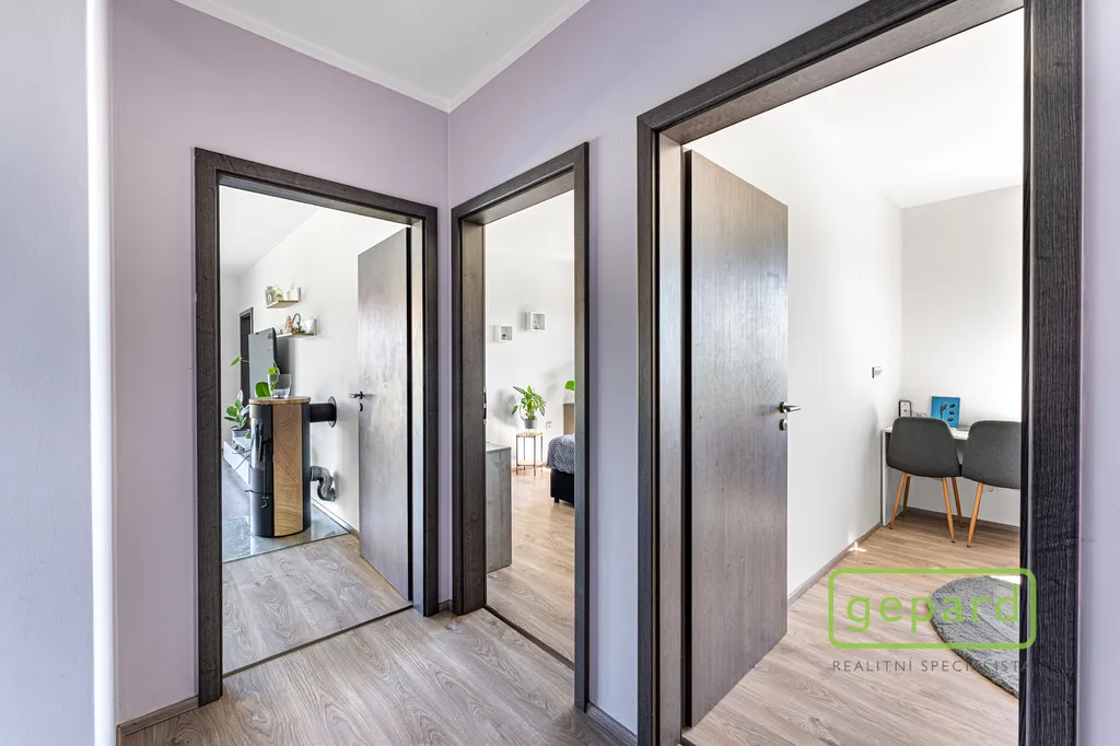 Jedná se o novostavbu s užitnou plochou 90 m², která na první pohled zaujme svým čistým a vzdušným designem. Interiér je laděn do moderních světlých tónů v kombinaci s dekorem dřeva, což celému prostoru dodává útulnou atmosféru. Srdcem domu je prostorný obývací pokoj s kuchyňským koutem, odkud vedou velké prosklené dveře přímo na terasu a zahradu. Dům dále nabízí tři samostatné pokoje, praktickou šatnu a moderní koupelnu, která je vybavena jak vanou, tak praktickou walk-in sprchovým koutem.
