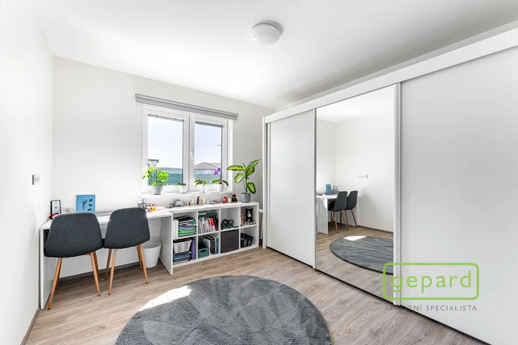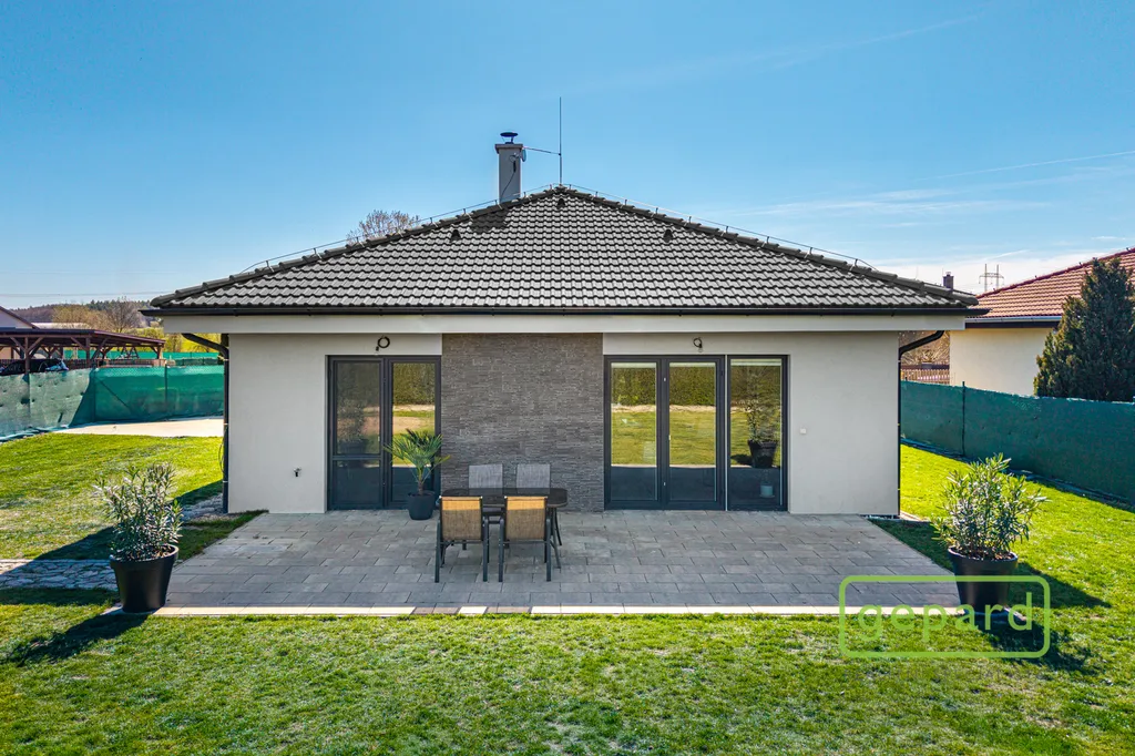 Jedná se o novostavbu s užitnou plochou 90 m², která na první pohled zaujme svým čistým a vzdušným designem. Interiér je laděn do moderních světlých tónů v kombinaci s dekorem dřeva, což celému prostoru dodává útulnou atmosféru. Srdcem domu je prostorný obývací pokoj s kuchyňským koutem, odkud vedou velké prosklené dveře přímo na terasu a zahradu. Dům dále nabízí tři samostatné pokoje, praktickou šatnu a moderní koupelnu, která je vybavena jak vanou, tak praktickou walk-in sprchovým koutem. O komfortní topení v domě se stará vodovodní podlahové vytápění s napojením na elektrokotel.