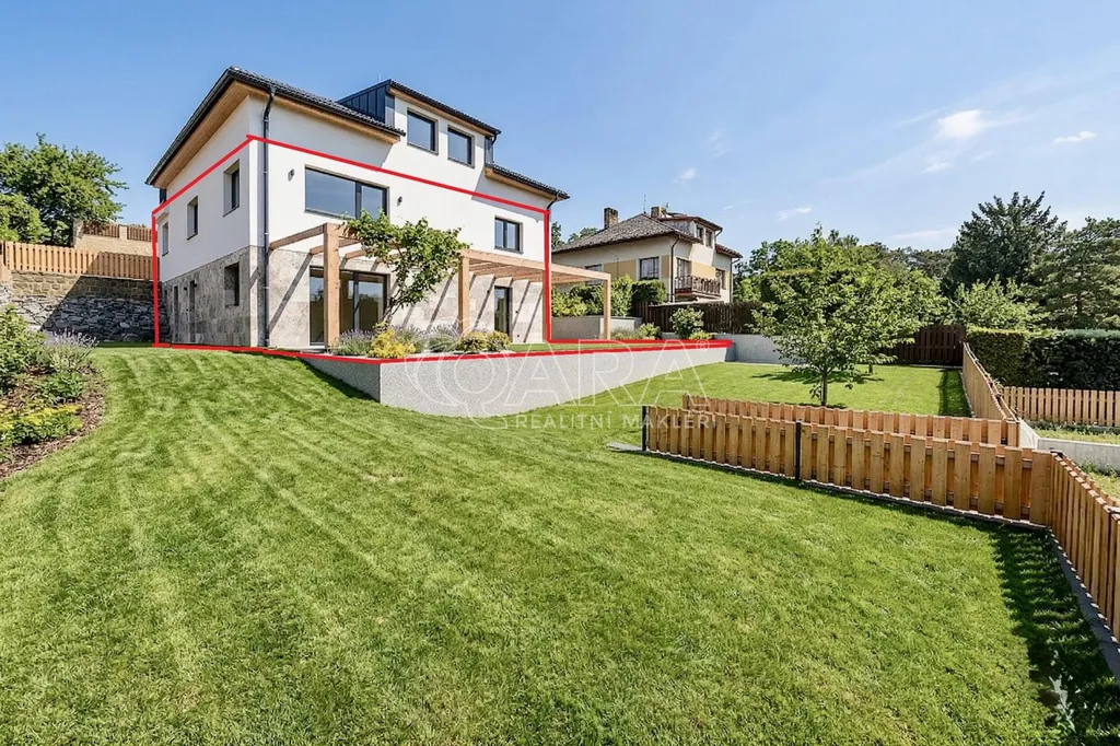 Luxusní mezonetový byt o dispozici 5+kk. Spoluvlastnický podíl odpovídající 68% na budově a pozemcích (celkem 735 m2). Obrovskou výhodou tohoto bytu je smluvně zakotvené právo výlučného užívání venkovních prostor. K bytu tak náleží vlastní pozemek (81 m²) a velká vyhrazená část společné zahrady, jejíž hranice jsou přesně určeny v prohlášení vlastníka.