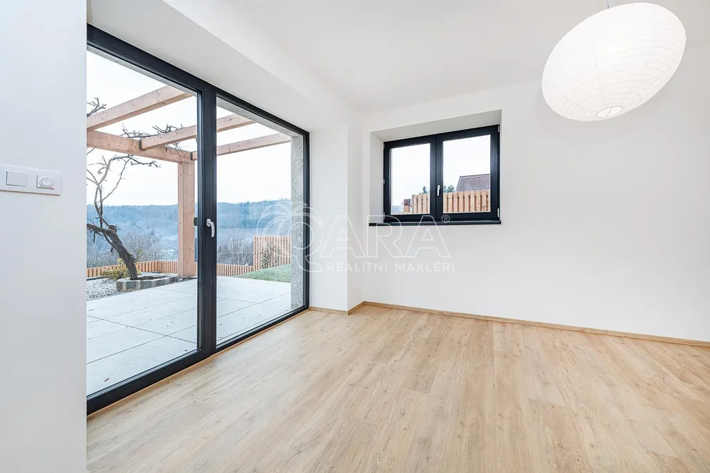 Pro páry milující styl: Užijte si velkorysý obývací pokoj s přilehlou terasou, kde se sklenka vína s přáteli mění v nezapomenutelný zážitek. Moderní design, výhled na lesy a horizont a zahrada bez nutnosti složité údržby jsou definicí svobody.