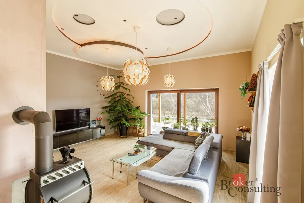 - v prostorném otevřeném obývacím pokoji který je spojen s moderní kuchyní se také nachází krb, který umocňuje zimní večery s výhledem na zasněženou zahradu, ale hlavně plní funkcí vytápěni krásným sálavým teplem.