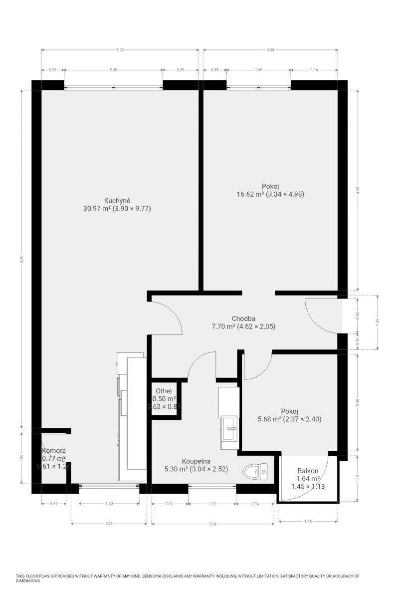 Byt se nabízí částečně vybavený. Kuchyně disponuje lednicí, myčkou, elektrickou troubou, varnou deskou, mikrovlnnou troubou a digestoří. Obývací část a druhý pokoj nejsou zařízeny. V koupelně je sprchový kout, umyvadlo a toaleta.